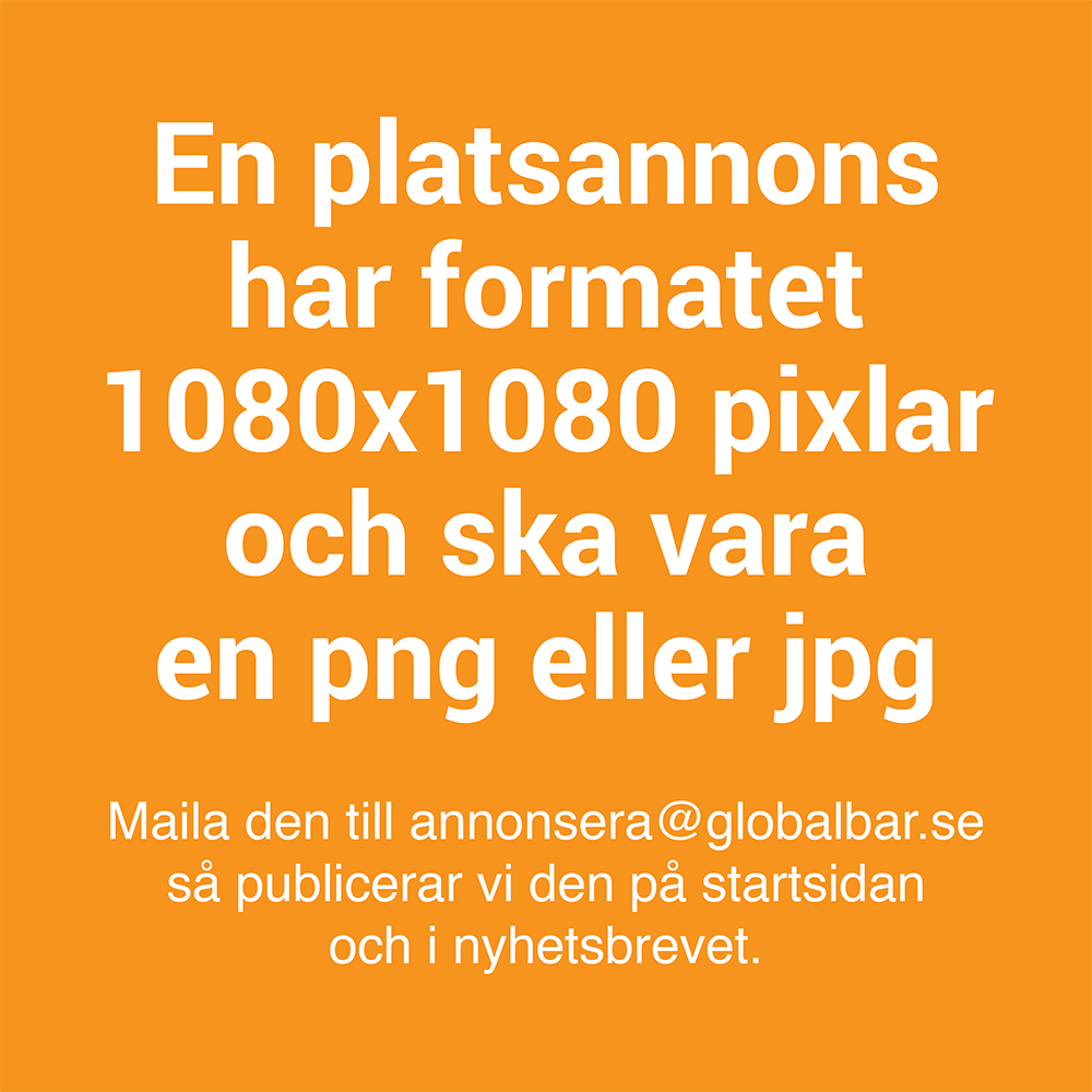 Beställ din platsannons genom att maila annonsera@globalbar.se. Bifoga en länk till annonsen eller skicka över annonsmaterialet i from av text, bild och logga så publicerar vi inom ett dygn.